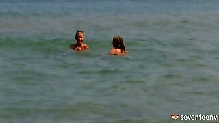 Bare beach girl with small boobs and her homie with big boobs are two kinky chicks