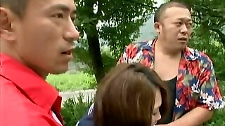 Horny brunette jade fucks with two brutal dudes in forest