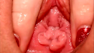 Woman with extremely big clit gropes it with fingers in close-up scene