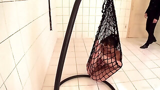meine unterworfene freundin war an einen stuhl geschnallt, ihr riesiger hintern stand mir gegenüber