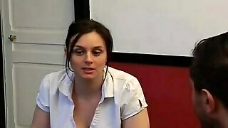Brutal boss romps his 4 eyed brown-haired waitresses at the table after work